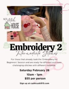 This class is for those that already took the ‘Embroidery for Beginners’ Session or have already embroider for at least 2 years.