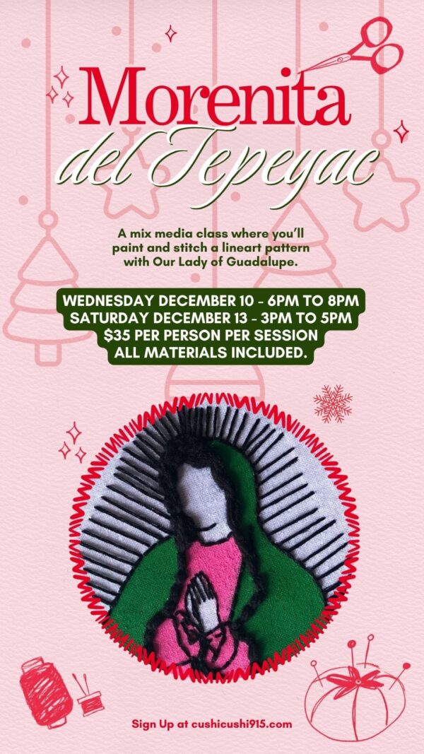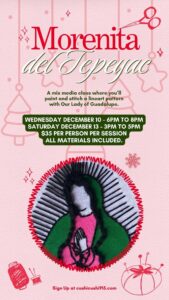 A mix media class where you’ll paint and stitch a line art pattern with Our Lady of Guadalupe.