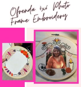 Come and stitch this 8-inch diameter project where you can attach a 4×6 picture of your loved one and display it on your Ofrenda.