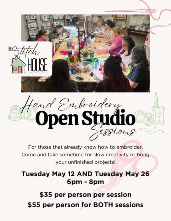 🧵 This class does NOT include materials or formal instruction, but it does include light drinks and snacks.