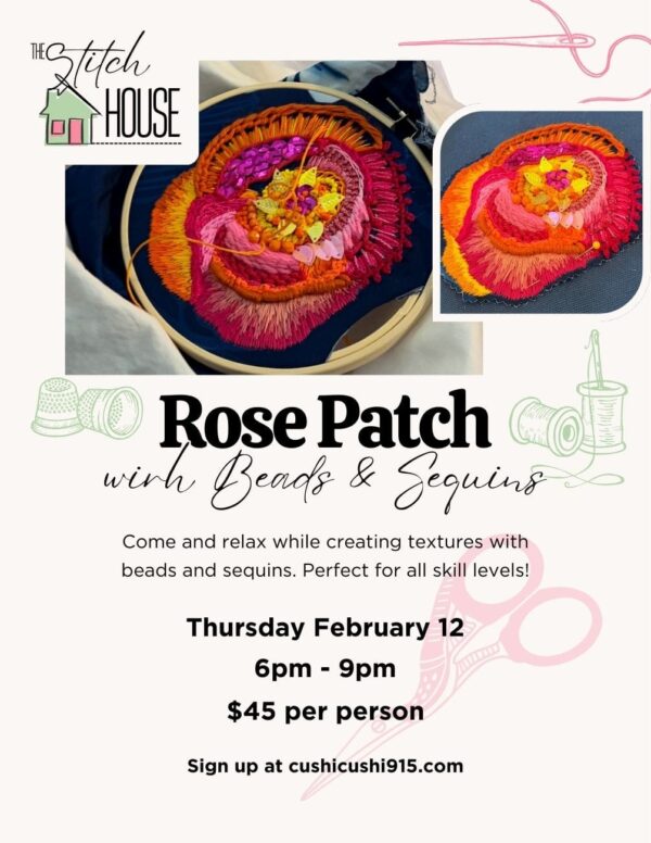 Create a Rose patch with simple embroidery stitches and create interesting textures on it by adding beads and sequins.